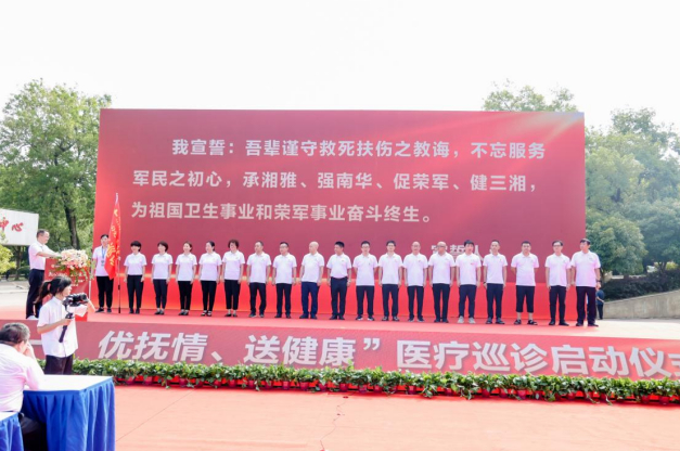 本次活动之一,就是在省退役军人事务厅的指导和支持下,前往平江县素有"将军之乡”美誉的长寿镇开展为期两天的送医送药活动。来自南华大学附属医院和湘雅医院18名专家,携带车载X光机、B超等各类检查化验设备及200余种药物,驱车奔赴革命老区、将军县--平江。
