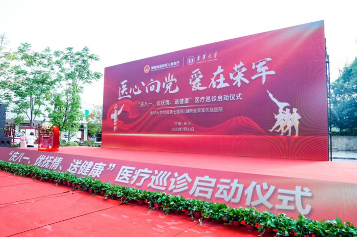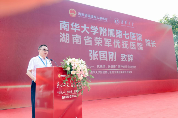 为进一步传承英雄红色精神,在第96个建军节来临之际,南华大学附属第七医院(湖南省荣军优抚医院)开展“庆八一、优抚情、送健康”专题医疗巡诊活动启动仪式。南华大学副校长夏昆,湖南省退役军人事务厅拥军优抚处处长宁耀磊,省财政厅、长沙市退役军人事务局、湖南省红十字会、中国人民解放军联勤保障部队第九二一医院、天心区退役军人事务局、南托街道、北塘社区、南托派出所相关领导,太平洋产险负责人,部分荣军优抚代表以及全体院领导班子等出席活动。