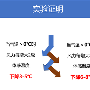 实验证明:当气温<0℃时,风力每增大2级,体感温度下降6-8℃。比如环境气温是零下10°C,但因为有很大的风,人体感觉到的“体感温度”是零下3°C,足足低了13°C!!这就是「风冷效应」。风冷效应是一种因风所引起的使体感温度较实际气温低的现象!