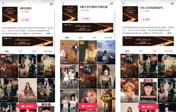 8月,抖音电商「抖in时尚趋势发布」联合时尚媒体《智族GQ》共同发布时尚趋势“美拉德风”,此后多位时尚作者参与话题讨论,吸引更多平台达人和用户参与到“美拉德风”的趋势当中。