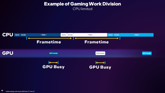 从图中可以看出,CPU准备渲染命令发送给GPU每一帧渲染画面指令都存在一个时间,也就是前后两次“Present”的时间间隔,即图中的Frametime(每帧时间),某种意义上,它代表的是“CPU有多忙”。而在GPU渲染部分,GPU渲染的每帧时间英特尔将其称为“GPU Busy”,代表的是“GPU有多忙”。