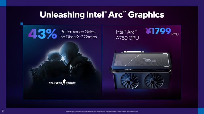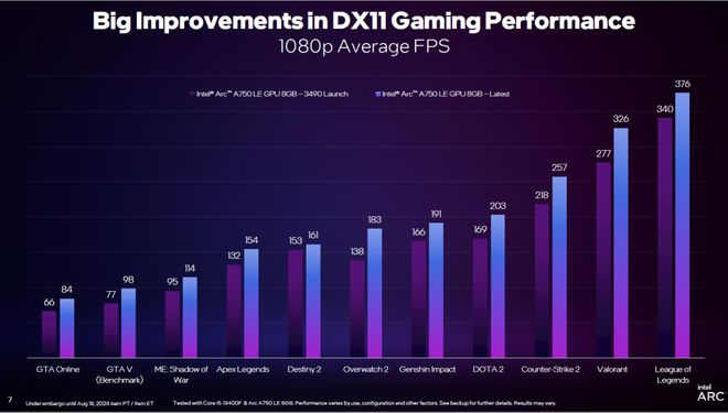 在锐炫独显发布之初,英特尔将驱动性能优化的重点放在了DX 9游戏性能的提升上,事实上我们也看到在2023年Q1~Q2 的几个月时间内,英特尔陆续发布的多版锐炫显卡驱动将DX 9游戏性能表现提升达到了平均约43%的恐怖程度。而同时,英特尔还在前几个月内针对锐炫显卡的价格进行了大调整,1799元的锐炫A750显卡也因此获得了非常优秀的性价比表现。在当时的4086版驱动与3490版首发驱动的比较中(《微型计算机》当时也有实测驱动性能对比,感兴趣的玩家可以参考我们之前的文章),包括《英雄联盟》《CS:GO》等热门游戏在内的性能提升都是非常明显的。