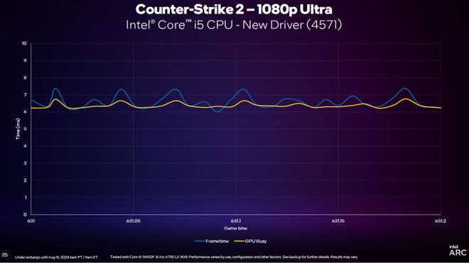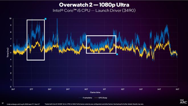 新的锐炫独显驱动专门针对Frametime进行了优化,显著改善了Frametime。可以看出Frametime排列更加紧密,而且大幅度减少了抖动,使得Frametime与GPU Busy无限接近,显著改善了游戏帧率表现。(蓝色为Frametime,黄色为GPU Busy)