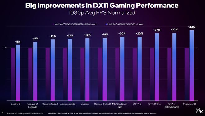 看得出,英特尔想要表达的意思就是新驱动在DX 11游戏性能上提升了19%,在游戏流畅性上提升了20%。当然,我们相信在未来的一段时间内,DX 11游戏性能的持续优化,都将是锐炫显卡驱动更新的主要努力方向,未来相信也应该会有更多的DX 11游戏加入优化列表,持续提升锐炫显卡的价值。