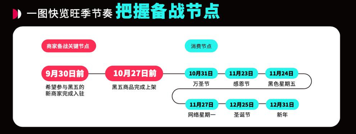 为了让跨境商家们更好地参与黑五大促,TikTok Shop官方发布了一份时间表。根据该时间表,有意向参与黑五大促的跨境商家们需要在9月30日前完成入驻,10月27日前完成商品上架。这将为他们提供一个充分的时间来准备和推广自己的商品,以满足消费者的需求和期望。