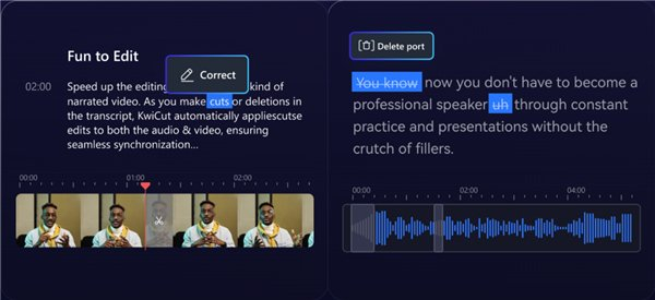 文字视频剪辑方向,Wondershare Kwicut可自动将音频转录为文稿,用户通过对转录后的文稿进行删减,可同步删减与文稿对应的音频及视频,只需三步即可对视频中包含人声的部分进行快速剪辑优化。此外,Wondershare Kwicut还可智能检测音频中的气口、语气词等特殊音节,用户一键即可删除多余部分,剪辑效率快速提升。