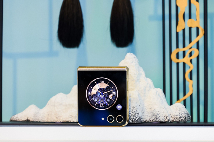 纵向折叠的心系天下三星W24 Flip以掌中宝盒般的精致身姿,带来优雅灵动的折叠体验。陶瓷机身背板采用“冰瓷白”配色,如同一块无瑕美玉,让仰慕之情油然而生。奢华金色边框勾勒的机身线条,动静之间流光浮动,婉若游龙。铰链盖上的宝石状方格花纹与金色“心系天下”标识交相辉映,尽显传承16代的匠心品质。“浮生若梦”动态壁纸与高端时钟动效,于方寸之间尽显奢华美感,令人过目难忘。