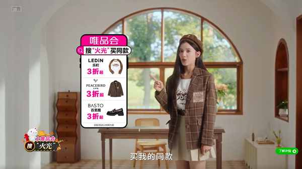 在《他从火光中走来》中,南初(张婧仪饰)是一名舞蹈演员,对事业和爱情有着坚定追求,角色受到了非常多年轻用户的喜爱。当南初扮演者张婧仪出现在中插广告,穿搭变换间输出“上唯品会搜‘火光’,买我的同款,有3折噢”信息时,IP价值、角色魅力与明星营销效应多重叠加,释放出了巨大的带货潜能。