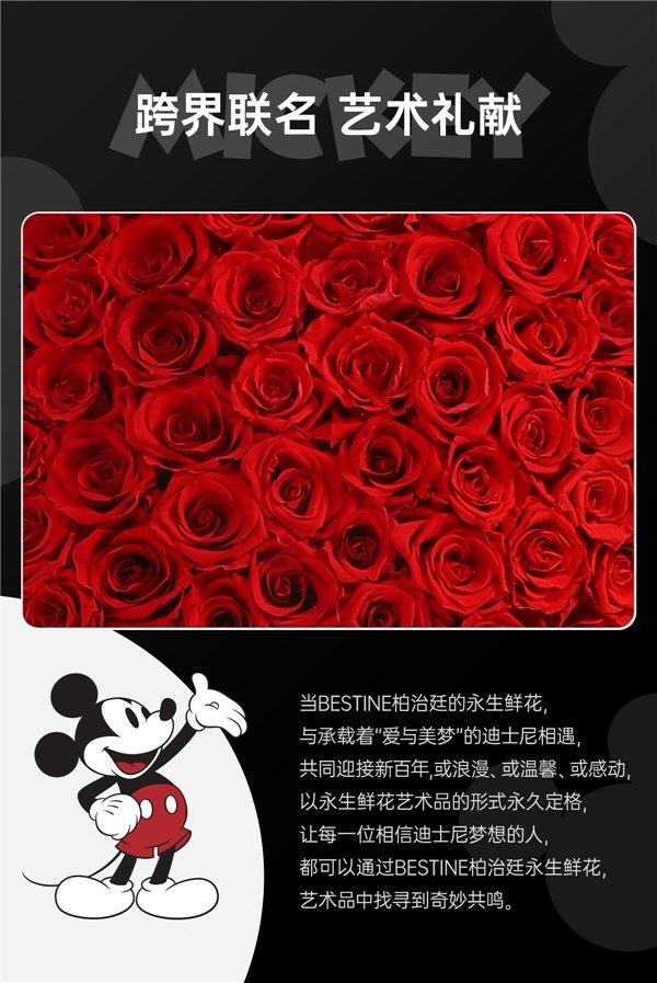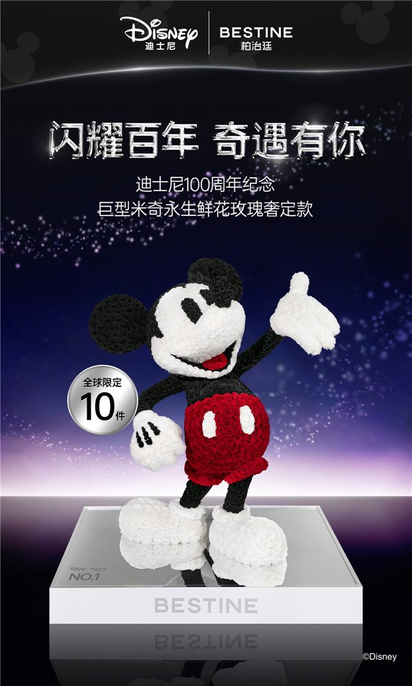 作为迪士尼永生鲜花系列产品的官方合作伙伴,本次首次跨界联名合作打造的100周年纪念限定款,BESTINE柏治廷用永不凋零的永生鲜花玫瑰塑造出迪士尼米奇经典荧幕形象,将浪漫与传奇角色造型巧妙结合,以创新方式阐述迪士尼品牌宗旨:激发人们想象力,由家人、朋友等共同创造美妙和永恒的回忆。