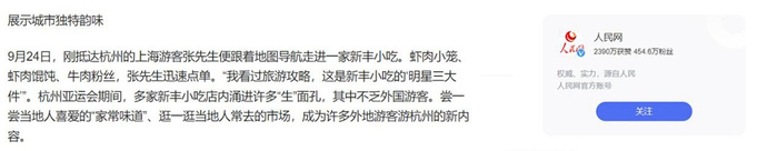 现场的新丰小吃员工表示,登上人民网报道让他们更加坚定了传播宋韵美食文化的信心,“亚运会是杭州向世界展示宋韵美食文化的舞台,我们会努力通过品尝和体验的方式,让更多海内外游客了解江南小吃的历史和文化,感受舌尖上的杭州,助力宋韵美食文化从亚运走向世界。”