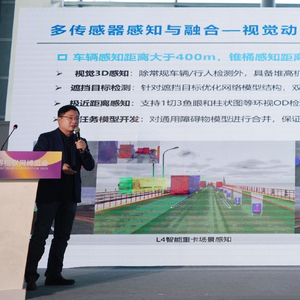 会上,赖杰分享了友道智途多传感器感知与融合的前沿落地经验。据他介绍,作为国内首个实现“真无人”技术验证落地并启动常态化测试运营的自动驾驶科创企业,友道智途拥有1000米超视距感知、多传感器融合感知决策、拟人化自动行车超车泊车、五车编队行驶等行业领先L4自动驾驶技术,能实现全场景360°动态目标识别,支持可通行空间检测、交通标志识别等功能,确保全天候、全场景实时环境感知。