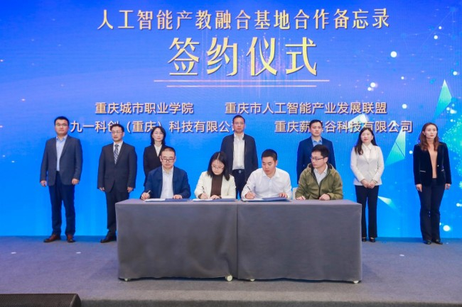 重庆城市职业学院、重庆市人工智能产业发展联盟、九一科创(重庆)科技有限公司、重庆薪乐谷科技有限公司四方签署共建“人工智能产教融合基地”合作备忘录。