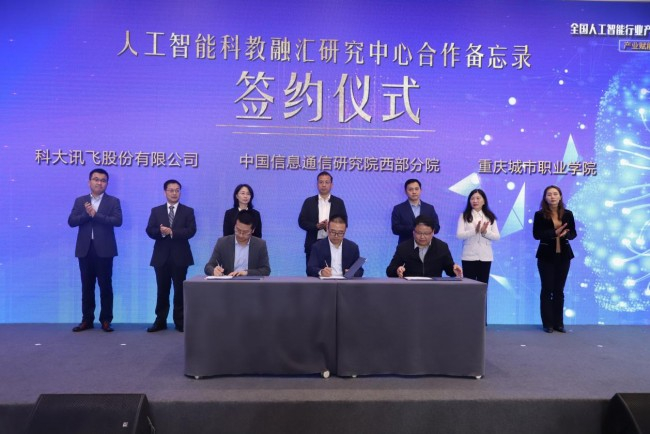科大讯飞股份有限公司、中国信息通信研究院西部分院、重庆城市职业学院三方签署共建“人工智能科教融汇研究中心”合作备忘录。