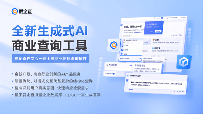 近日,爱企查在文心一言官网上线“商业信息查询”插件,引领商查行业AI产品服务创新升级。