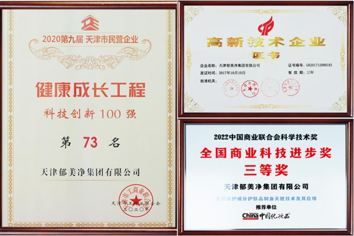 一方面,郁美净联合国内知名的高校和科研院所,形成“院校+科研机构+企业”的产学研用模式,强化药理学与皮肤学研究分析能力,建立原料、工艺、检测、功效、评价全链条研究体系,目前已拥有200余项专利及多项自主研发技术,并获得“高新技术企业”、“天津市民营企业健康成长工程科技创新100强”、“2022年度全国商业科技进步奖三等奖”等科技奖项与资质。