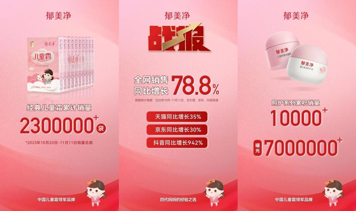 今年9月,郁美净在专家权威意见指导下,重磅推出全新的中国儿童湿疹肌护理解决方案——郁美净“照护”系列新品,从中国宝宝的肌肤特点出发,根据南北方环境特点,分龄分域定制产品配方,精准满足了新一代家长为宝宝护肤更高阶、更侧重专业场景和功效性的需求,在本次双11中获得了较高的讨论度与曝光量,也成为不少家长关注和选购的对象。