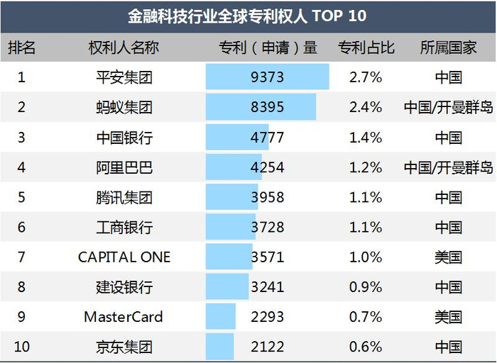 2018年以来,金融科技行业的科技创新领军企业包括平安集团、蚂蚁集团、中国银行、阿里巴巴、腾讯集团、工商银行、CAPITAL ONE、建设银行、万事达卡以及京东集团,位列专利权人榜单前十位。