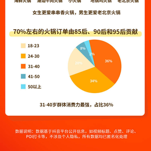 从年龄段来看,70%左右的火锅订单由85后、90后和95后贡献。其中,31-40的人群消费占比最高,达到了36.58%。