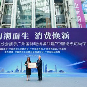 12月9日,向潮而生,消费焕新——中国纺联流通分会携手广州国际轻纺城共建"中国纺织时尚中心"活动在广州国际轻纺城1楼中庭广场隆重举行。活动上,中国纺织工业联合会流通分会向广州国际轻纺城授予"中国纺织时尚中心"牌匾,标志着全国首个纺织时尚中心正式落户广州市海珠区。