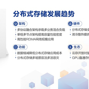 面对AI智能时代的存储新需求,《白皮书》分析了不同细分场景下的工作负载模型,并从架构、功能、硬件和生态四大维度分享了分布式存储的最新技术趋势。目前,多协议融合、单框多节点、高性能RDMA网络规模应用等前沿技术正在推动分布式存储的架构变革,而场景化无损压缩、多活容灾等技术则在功能层面突破了传统性能的边界。结合NVMe闪存等硬件创新以及产业生态的持续发展,分布式存储拥有了更高带宽、更低延迟、更强并发能力和出色可扩展性,能为AI时代各类场景化应用构建智能创新的数字底座。