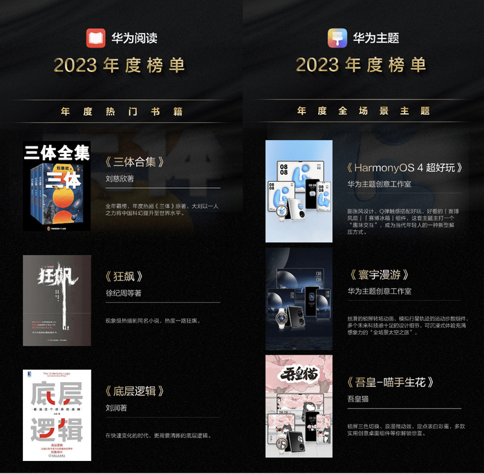 华为主题根据用户的商务、科技、艺术等多样化需求,展现了年度最受欢迎的全场景主题、个性主题、和智能表盘。榜单中的作品设计多样,特别是年度全场景主题,《HarmonyOS 4 超好玩》、《寰宇漫游》和《吾皇-喵手生花》凭借创新力和高玩性受到用户青睐。《蝶翼》、《半边山》、《灵动光环》等主题则以高话题度和独特设计赢得了年度主题的桂冠。表盘方面,从经典致敬到创意无限的设计,如《臻享陀飞轮》、《小新昼夜漫画》、《立体清新瓷白》都为用户提供了实用又时尚的选择。