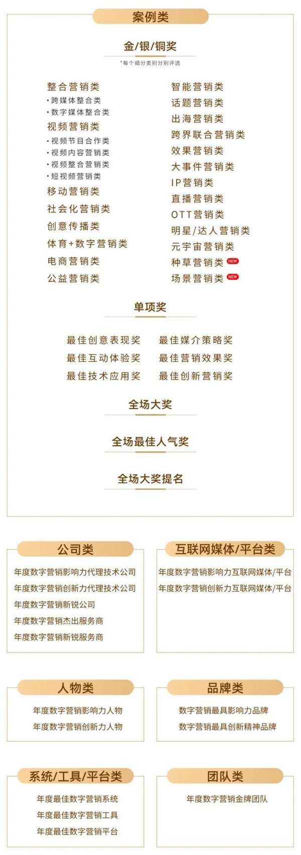 本届大赛共设置7大类别奖项,分别是案例类、公司类、互联网媒体/平台类、人物类、品牌类、团队类、系统/工具/平台类。