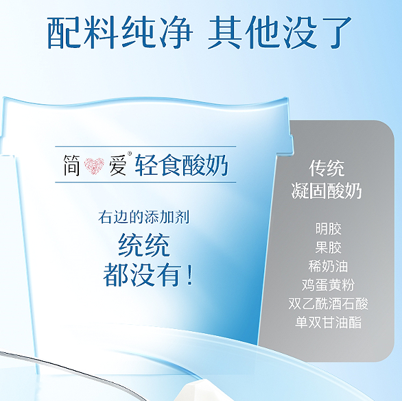 轻食酸奶0%蔗糖坚持纯净配方,沿用简爱“无蔗糖不酸”的生产制造体系,生产全程不添加任何代糖、蔗糖,通过鲜奶浓缩技术和独特的发酵工艺,最大限度弱化酸奶酸涩口感,让健身减脂人群营养、美味两不误。