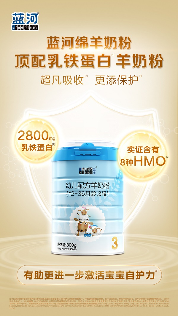 作为蓝河差异化布局绵羊奶粉品类的升级力作,蓝河绵羊奶粉2023年通过新国标注册,配方全新升级,具有“超凡吸收3 更添保护4”的产品特色。在自护力方面,每罐添加2800mg乳铁蛋白5,不仅含量在羊奶粉领域遥遥领先,而且达到专家建议的每日有效补充量4,叠加近期实证含有8种HMO1,以“2800mg乳铁蛋白5+实证8种HMO1”的硬核组合,助力宝宝打造自护力新高度。在吸收力方面,绵羊奶天然小分子更好吸收6,加之添加的4.2g/100g7新一代专利OPO8、120亿活性益生菌、双益生元,可助力宝宝肚肚添活力。在脑视力方面,蓝河绵羊奶粉添加更高含量的DHA、ARA、叶黄素9且实证含有8种HMO1,这些更有助于宝宝眼脑发育。