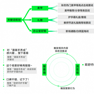 但在小红书的搜索语境下,漏斗式的营销进程被颠覆成了网状关联的结构营销。这种模式强调的是场景和产品之间的关联,以此来激发用户潜在消费意愿,从而进行主动搜索的行为。