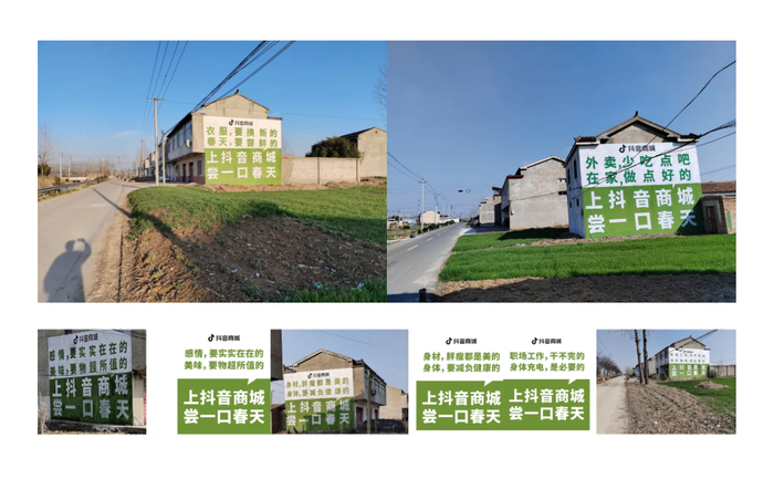 同时,抖音电商还在线下以规模化曝光的手法,在商圈、梯媒等中心化资源位,进行广告投放,提升活动在公共场所的亮相频次和密度。并以建筑外墙为介质,通过蕴含生活态度的创意文案,传递春日情绪。