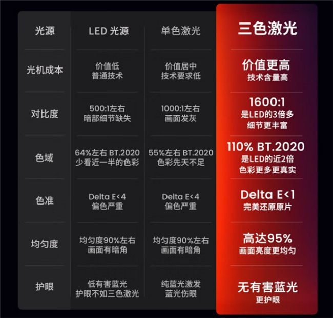 LED光源虽然稳定,价格低廉,但它的亮度有局限性。相比之下,三色激光光源在亮度、色域覆盖、对比度、亮度均匀度等方面,全面赶超LED光源投影。同等价位的两系列产品,三色激光投影基本上是碾压式的超越。这也是为什么坚果早在几年前就开始布局三色激光投影的原因。时至今日,坚果的三色激光投影已经在行业内扎下根,成为用户选择家用投影仪的首选产品。当然,除了坚果以外,海信、当贝、光峰等品牌也有布局三色激光投影,就连此前不看好三色激光的极米,也在今年发布了3款三色激光投影产品。