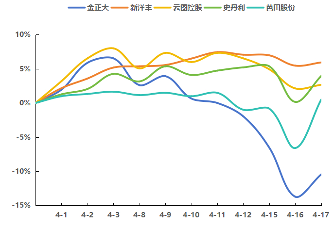 证监会进一步对政策解读后,4月17日,A股市场迎来反弹。通过对比4月17日的分时图,可以发现金正大的分时表现远远强于深证成指及农化制品指数,也正说明了金正大股价本周的下跌,是明显市场情绪错杀,短期内将迎来一波快速修复行情,涨幅将显著超越同行业可比公司。