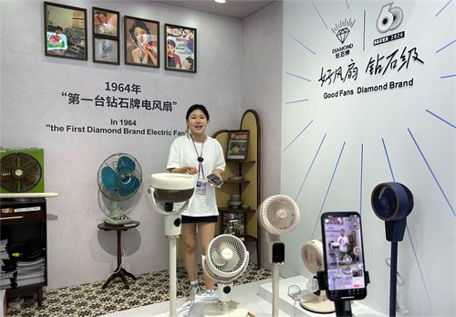 位于展位现场历史场景区域的几台80年代钻石牌历史电风扇引起了诸多瞩目,许多客商纷纷感慨并掏出手机拍照留念,一位来自香港客商惊喜地感叹道:“我们家还有一台用了二十年的钻石牌风扇,没想到也能在这里再次看到它的新身影!”作为“老广交”,钻石牌从参展第一届广交会开始,67年从未缺席,成为名副其实的“广货名片”。