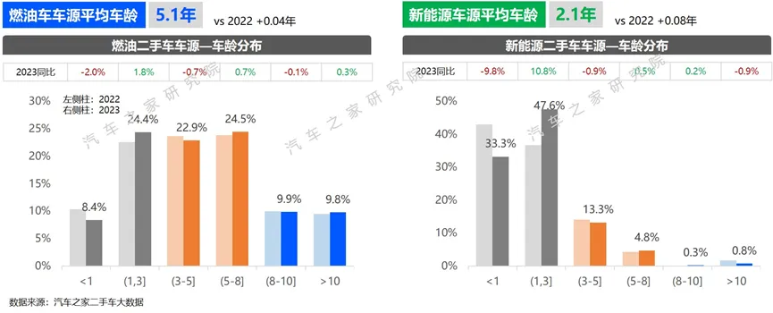 3、 2023年燃油二手车源平均车龄5.1年,新能源车龄更短,仅为2.1年,相较去年车龄均在变长