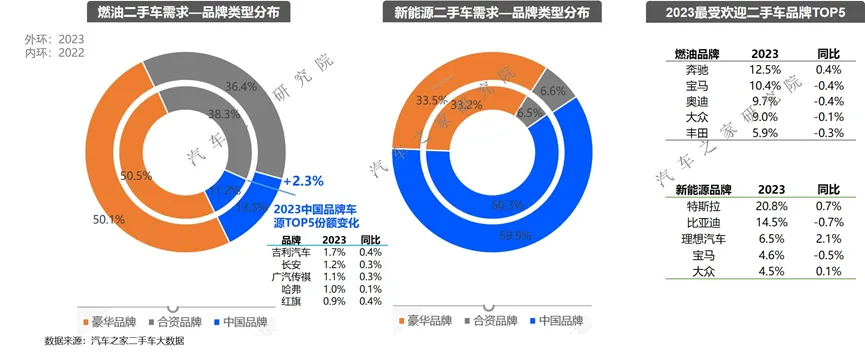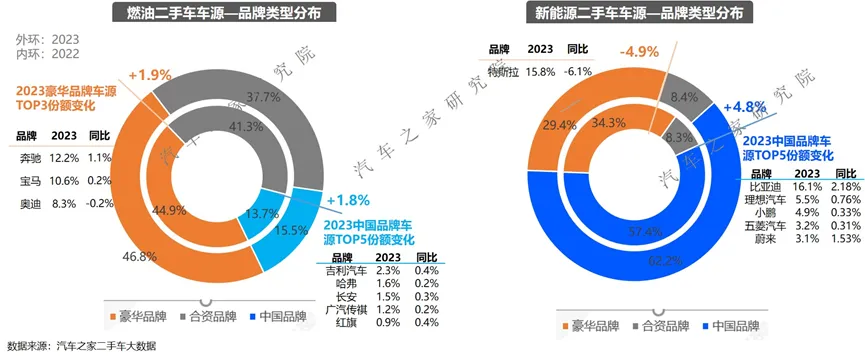 从燃油和新能源二手车市场的品牌类型结构来看,供需结构一致。