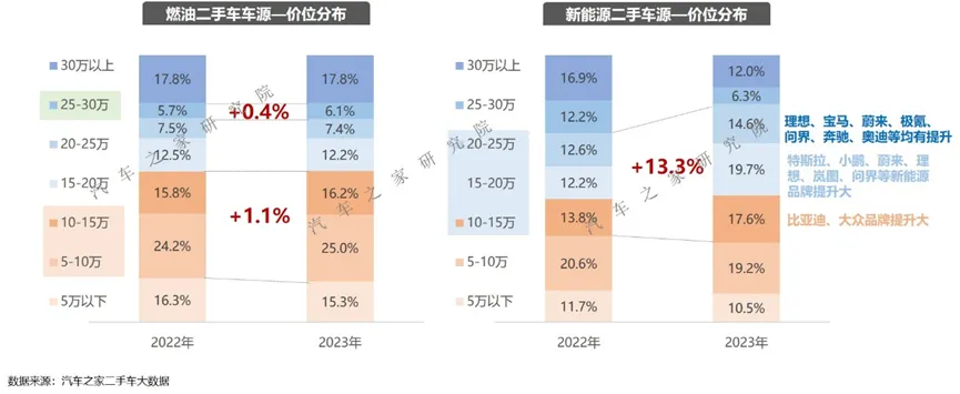 燃油二手车源价格结构稳定,新能源二手车价降幅较大,车源向中端价位集中