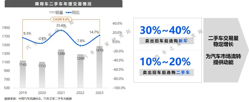 1、 2019~2023年二手车交易复合增速6.6%,超过新车市场复合增速(1.2%)