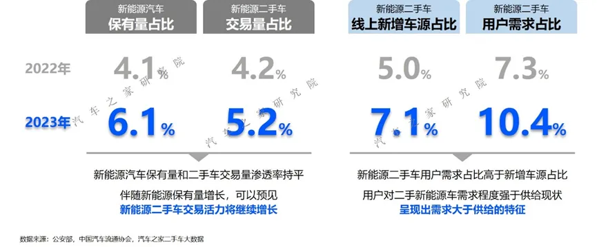 近两年来,新能源在汽车保有量中的渗透和新能源在二手车交易量中的渗透情况基本同频,可以预见的是新车新能源市场的发展将继续向二手车市场输入新能源车源;现阶段二手车市场需求大于供给,随着新能源产品力的提升也会进一步促进新能源二手车购买需求的释放。未来新能源二手车交易活力将继续增长。