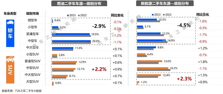 从二手车源级别分布来看,无论燃油还是新能源,车源供给均以轿车为主但供应开始萎缩,SUV供应增加,燃油紧凑型至中大型主流市场供应增加2.2%,新能源中大型及以上级别车型供应增加2.3%,新能源二手车源供给正逐渐转向更大级别的SUV市场。