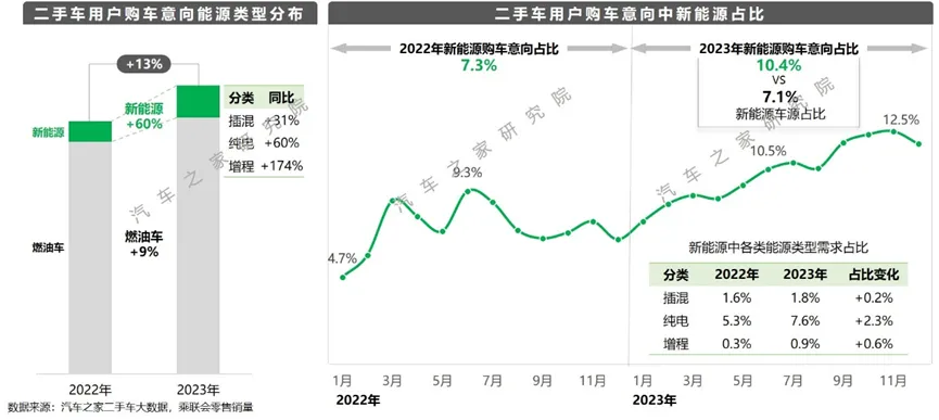 2023年新能源购车意向占比已超过10%,年底最高达到12.5%,高于新能源车源占比,需求持续旺盛且需求大于供给。