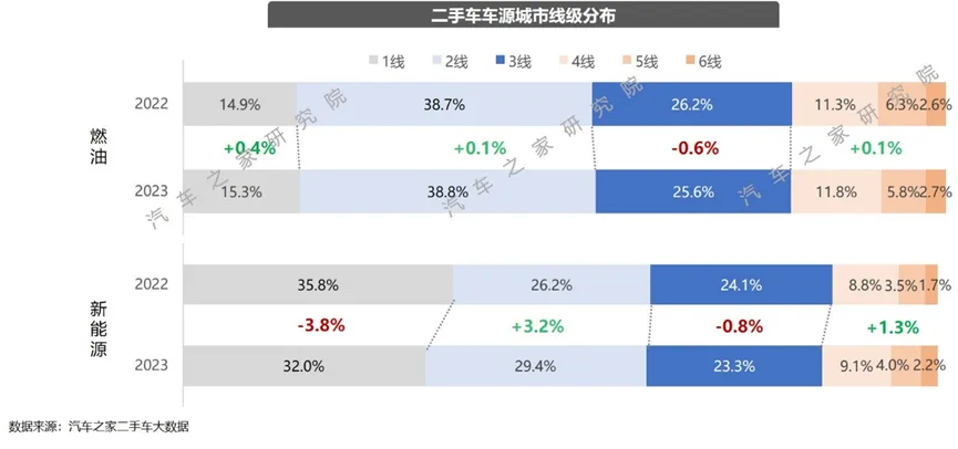 新能源车源则主要在一线城市,线级越高车源量占比越多,随着新能源渗透率在低线级城市的不断提升,新能源车源结构也会不断向燃油车形态靠拢。