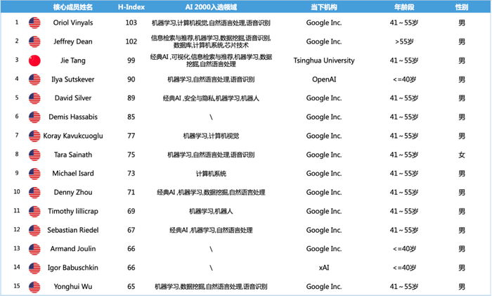 十个大模型团队中不乏学术贡献卓越的学者,其中有 86 人被评为“AI 2000 全球人工智能学者。下表列举了 H-index 前 15 名核心成员,最高 H-index 达 100,对学术领域做出不可忽视的贡献。