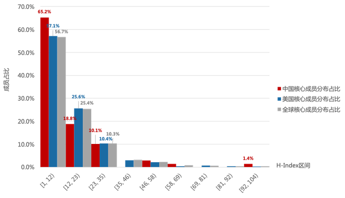 核心成员学术影响力:成员主要集中在 H-index35 以内