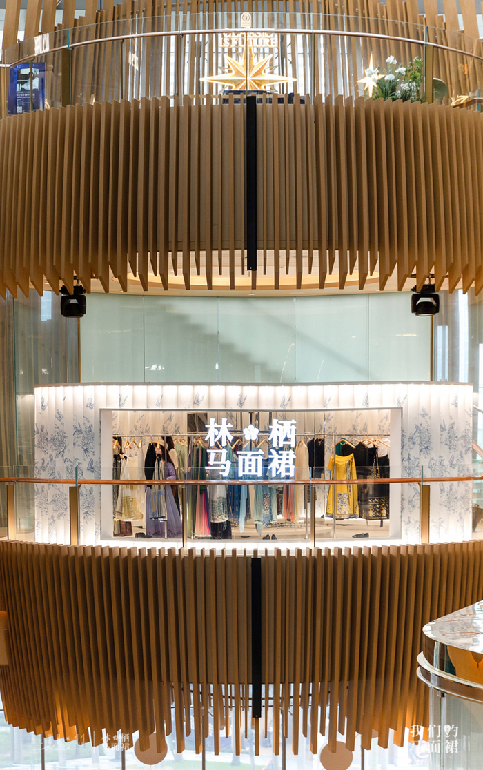 而林栖马面裙体验店正是容纳这样理念的一个空间。该体验店位于K11艺术购物中心4楼中庭,门店设计提取粤绣产品纹样,利用其华丽有层次的特点,塑造二方连续向四方连续演化的视觉效果,远观可以看到门店通亮的褶皱图案,和空间自然融入。
