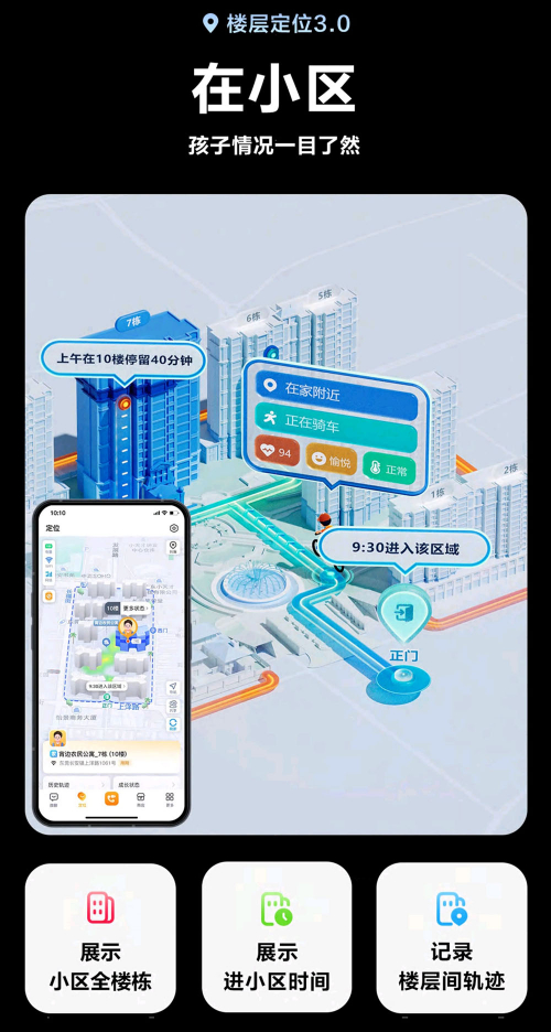 以楼层定位3.0功能为例,在自研锁楼算法的帮助下,小天才旗舰Z10的定位可以精准到具体的楼栋号、室内楼层。同时,小天才旗舰Z10定位还支持区域内全楼栋立体化展现,家长可以更直观地看到孩子是什么时候进入该楼栋,在楼栋的哪一层、逗留了多长时间、孩子在哪个小朋友家等信息,全都一目了然。