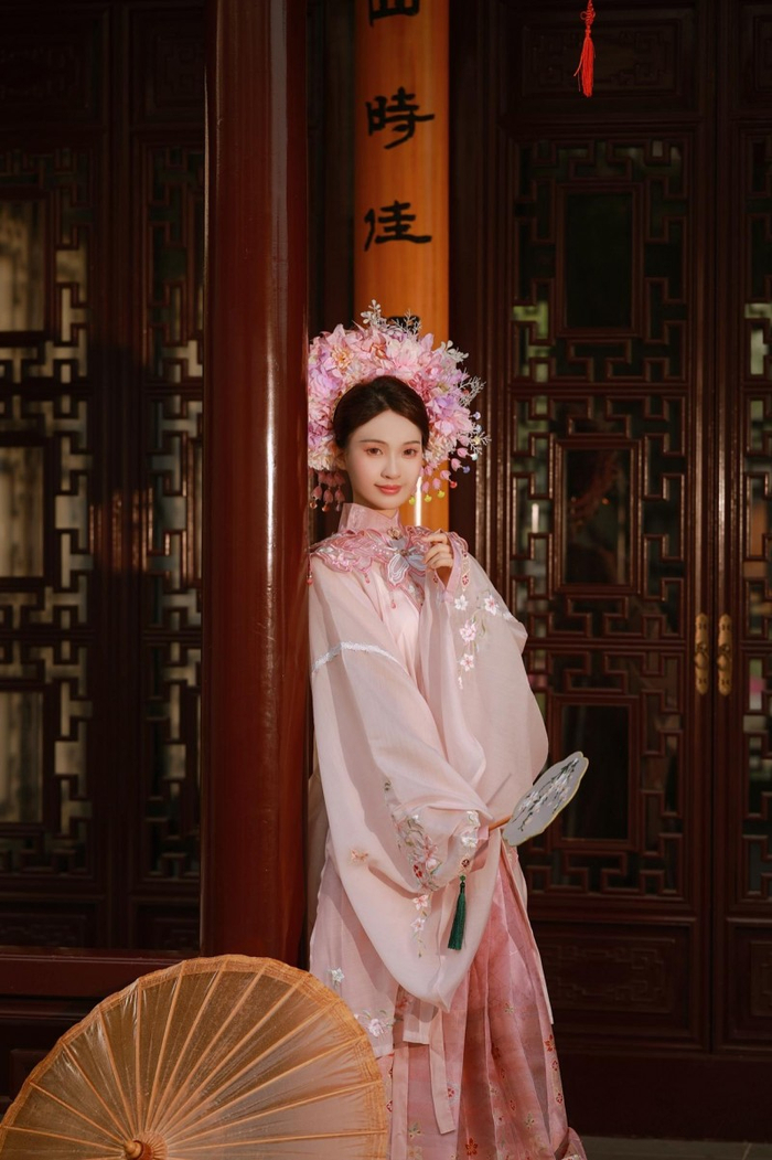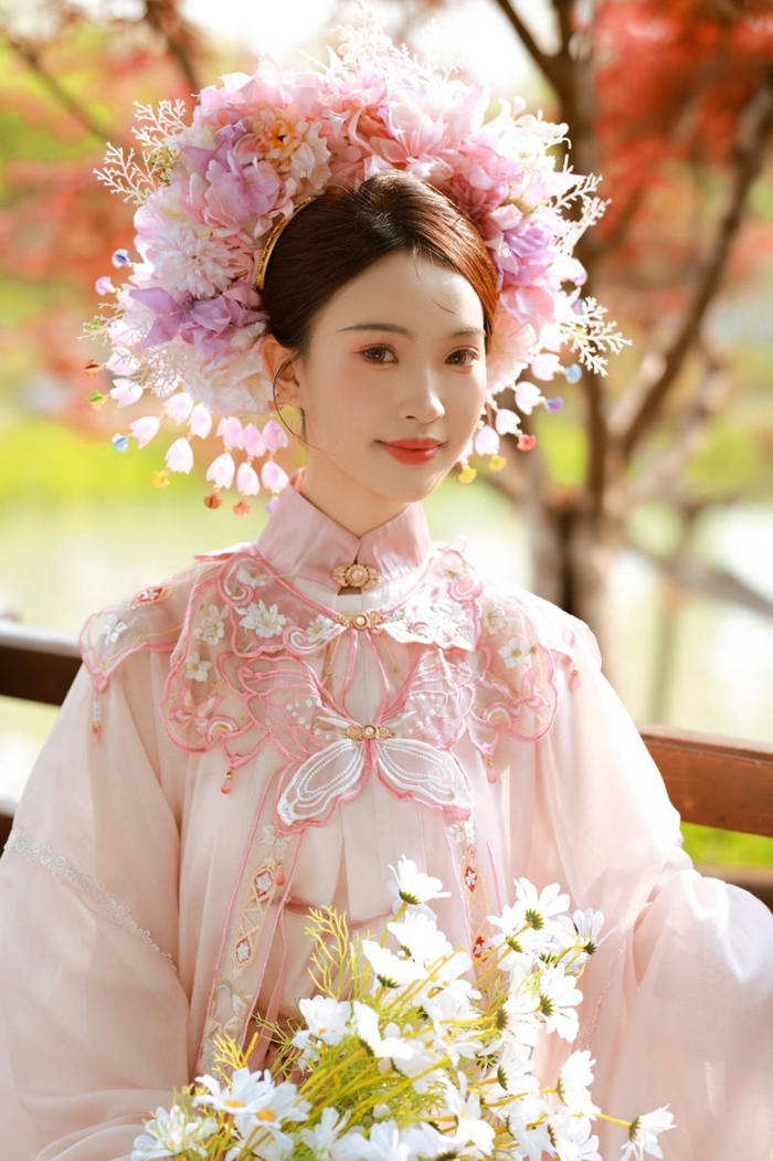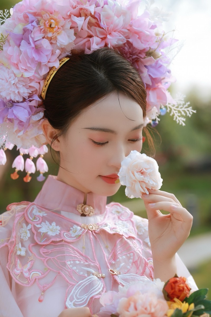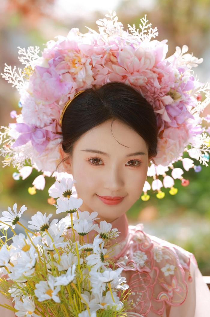 至于拍照时候的美姿,则是可以可以歪头微笑,自然一些看向镜头,当然也可以摆弄花篮里的花让摄影师抓拍、抬起扇子探出头微笑等等这样的方法来自然的面对镜头,把自己最美的一面展现给镜头就可以了。