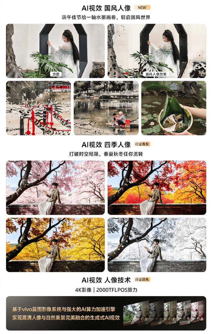 值得一提的是,通过MediaTek第七代AI处理器NPU 790强大的生成式AI能力与AI蓝心大模型配合,vivo X100 Pro带来超能创图功能,可实现AI消除路人,让户外拍摄告别废片,张张满意。搭载天玑9300+芯片的vivo X100s Pro和vivo X100s更带来AI视效、四季人像和国风人像,可实现照片中季节、环境和风格的自由切换,为用户带来极具创意的影像体验。