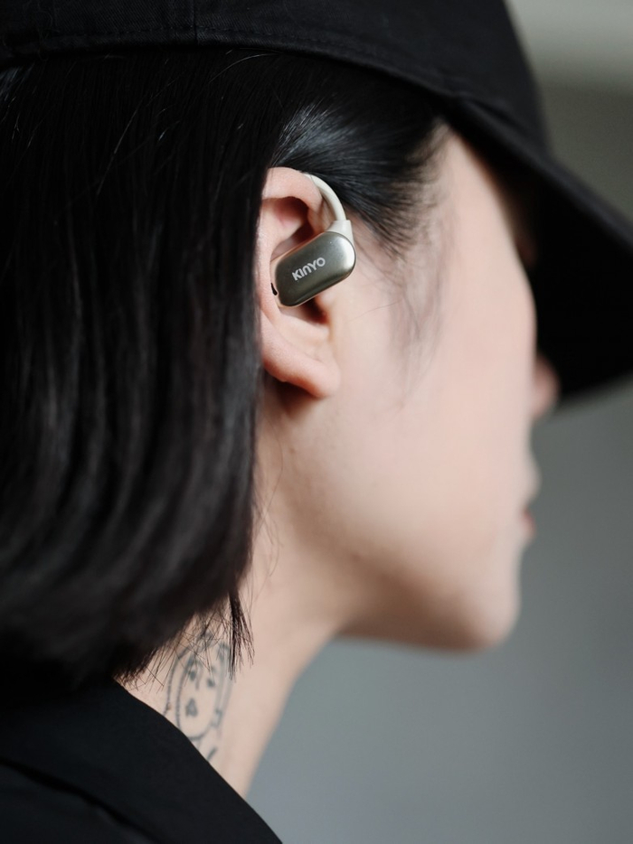 金运i39耳机采用挂耳式设计,整体造型时尚简洁。耳挂部分采用0.7mm柔韧钵丝,不挑耳型,佩戴舒适且稳固,即便是运动时也能保持稳定不移位。耳机单只重量仅为6.4g,佩戴时几乎感觉不到重量,真正实现了“零感亲肤”。