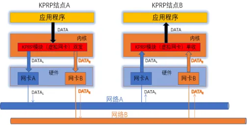 KPRP双网方案以PRP并行冗余协议为基础,将两块物理网卡虚拟成一块逻辑网卡,共享一个IP地址和一个MAC地址资源。数据发送时,在操作系统内核的数据链路层将数据报文克隆一份,并在数据链路层报文的尾部插入序列号等冗余控制字段,分别由A/B两个网络发送出去。接收时,以发端MAC地址和序列号为键值,采用滑动乱序窗口和位图表算法进行重包判断,接收先到的报文,抛弃后到的报文,保证网络数据报文的一致性。