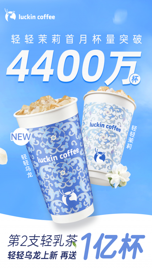 9月3日,瑞幸咖啡宣布,轻轻茉莉·轻乳茶上市首月杯量突破4400万杯。瑞幸第2支轻乳茶——轻轻乌龙·轻乳茶已正式上市,真奶好茶轻负担,高品质下午茶新选择。此外,为回馈消费者,瑞幸咖啡重磅宣布“上午咖啡下午茶”活动再送1亿杯9.9元下午茶。